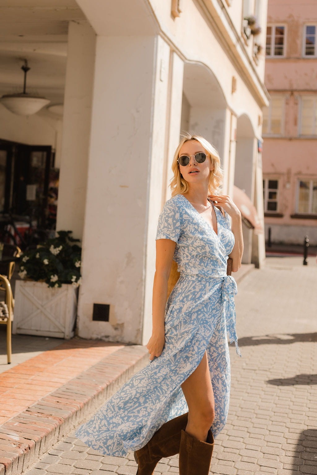 Sukienka Kopertowa Maxi to propozycja uszyta z krepowej wiskozy o przepięknym, kwiecistym princie na błękitnym tle. Sukienka posiada kopertowy krój z szerokim i długim paskiem idealnie podkreślającym talie. Dekolt w serek efektownie eksponuje kobiece kształty i wydłuża sylwetkę. Rozporek na przedniej nodze ciekawie przełamują formę sukienki, nadając jej lekkości i powabności przy każdy kroku. Krótkie rękawki z marszczeniem na szczytach ramion dodają uroku. W szwach bocznych znajdziesz uwielbiane przez Ciebie kieszenie, możesz wrzucić do nich drobne, kluczyk od auta, albo po prostu schować ręce, by poczuć się na luzie ;)