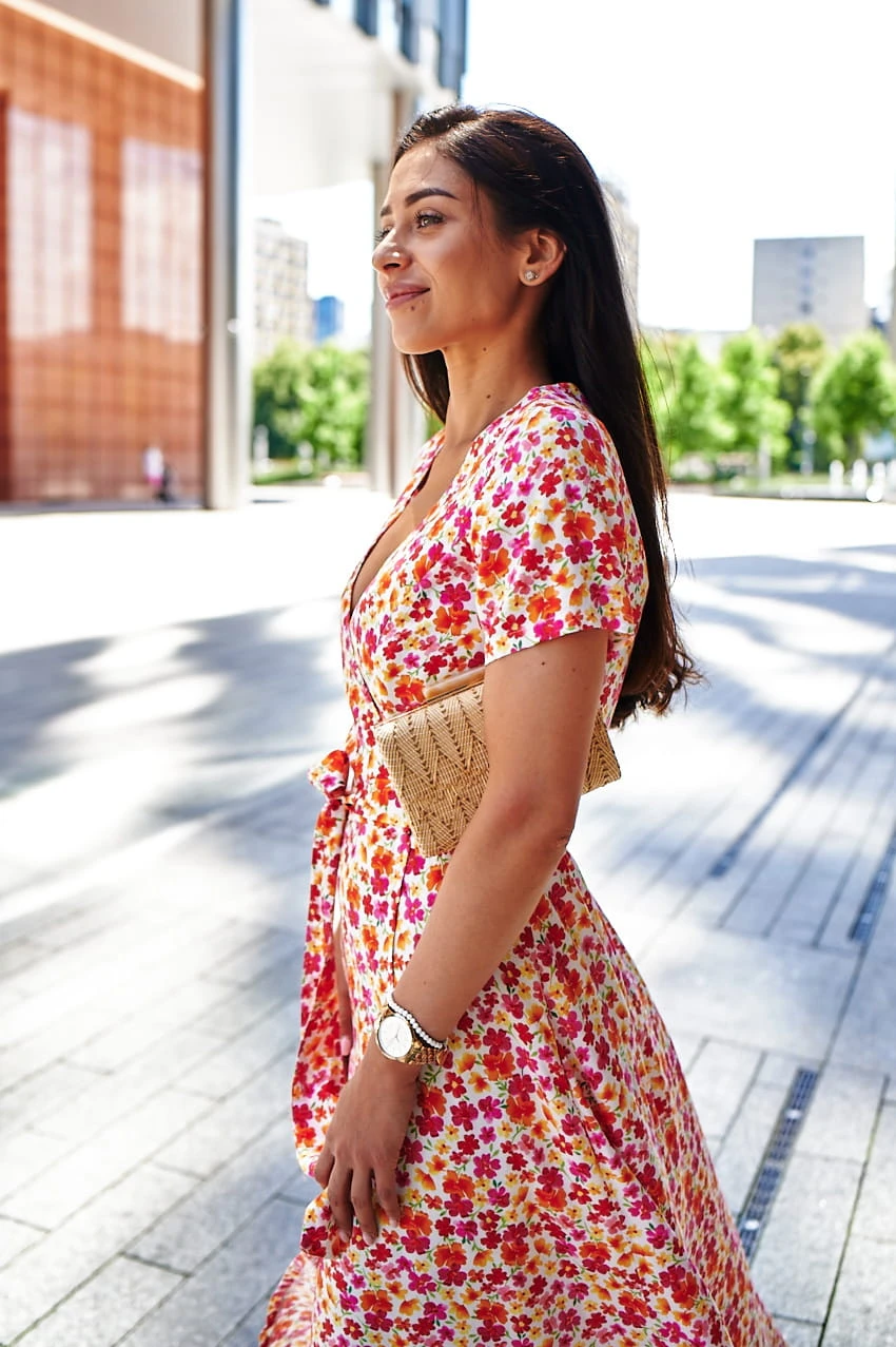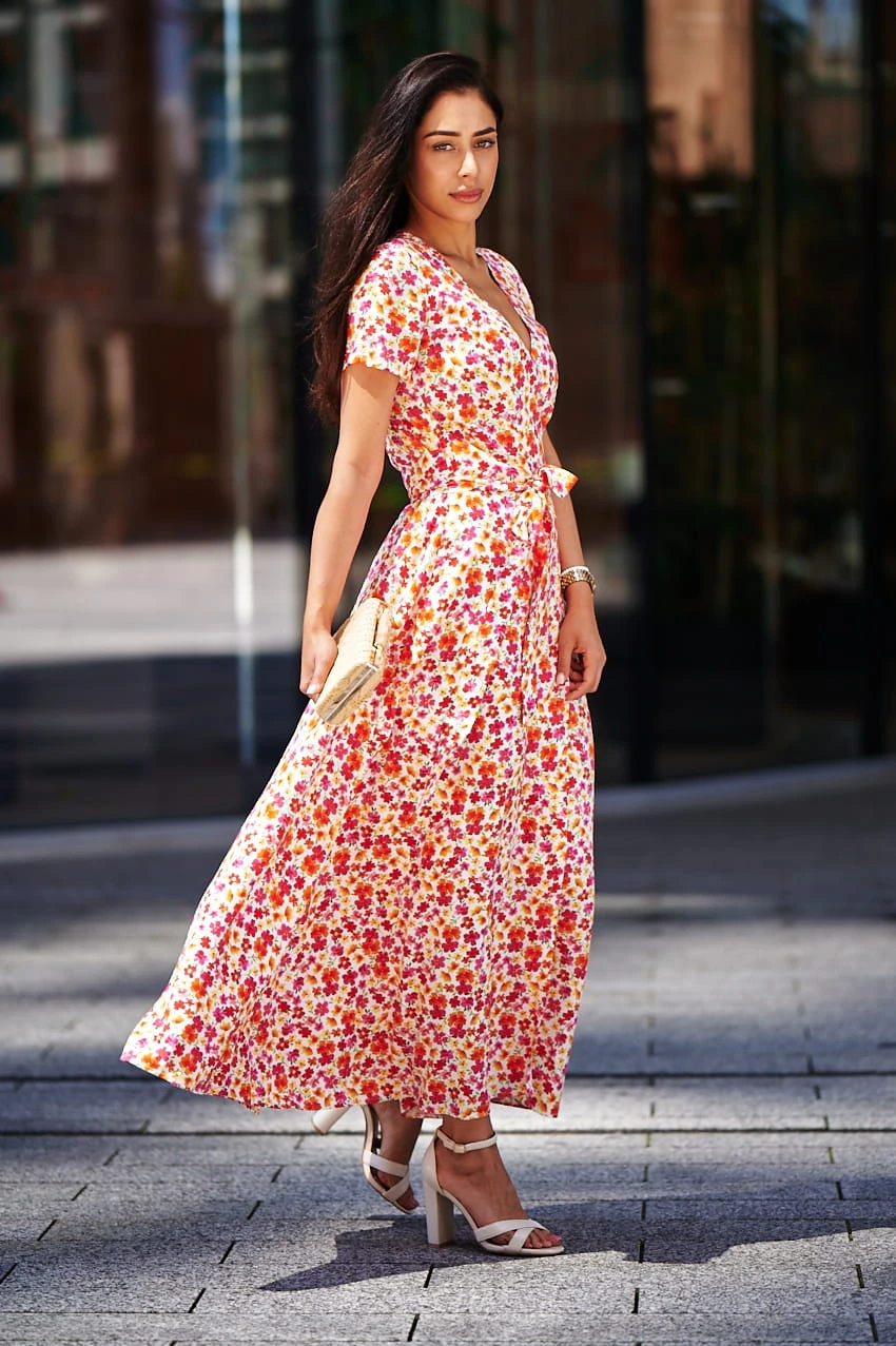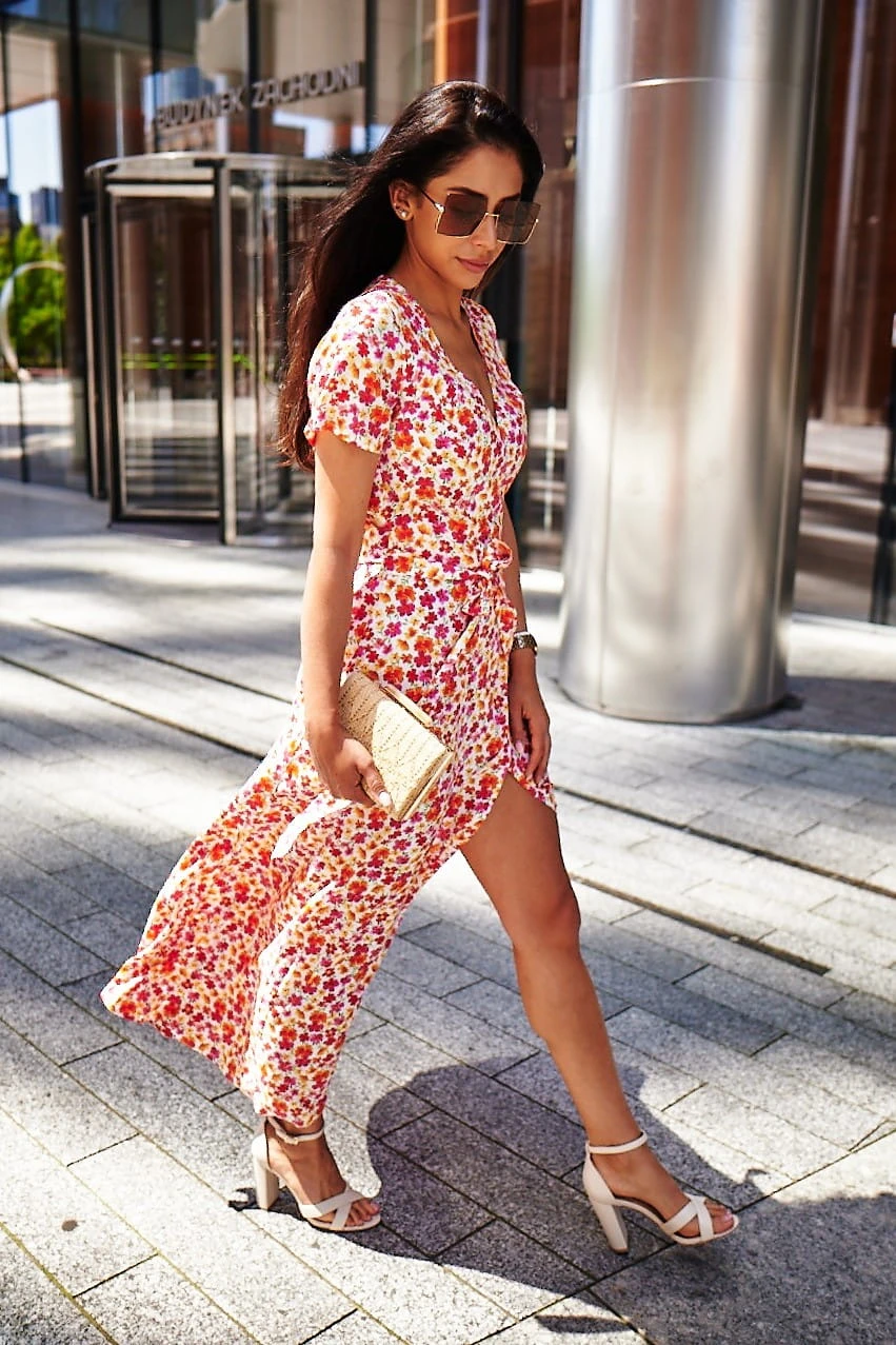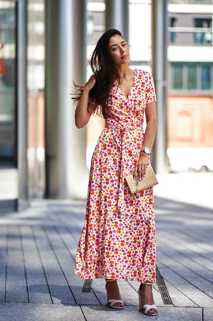 Sukienka Kopertowa Maxi to propozycja uszyta z delikatnej wiskozy o przepięknym kwiecistym princie w najmodniejszym połączeniu kolorystycznym w tym sezonie. Sukienka posiada kopertowy krój z szerokim i długim paskiem idealnie podkreślającym talie. Dekolt w serek efektownie eksponuje kobiece kształty i wydłuża sylwetkę. Rozporek na przedniej nodze ciekawie przełamują formę sukienki, nadając jej lekkości i powabności przy każdy kroku. Krótkie rękawki z marszczeniem na szczytach ramion dodają uroku. W szwach bocznych znajdziesz uwielbiane przez Ciebie kieszenie, możesz wrzucić do nich drobne, kluczyk od auta, albo po prostu schować ręce, by poczuć się na luzie ;)