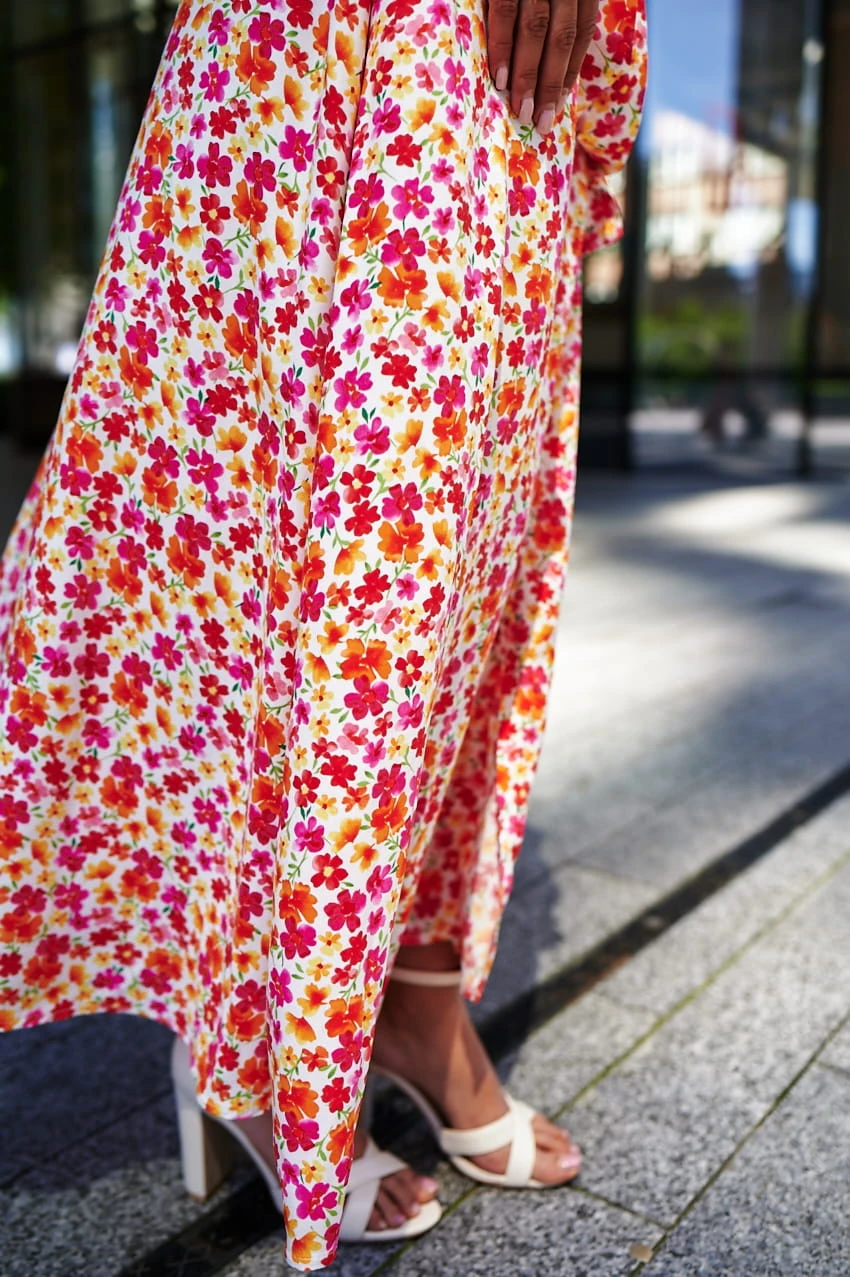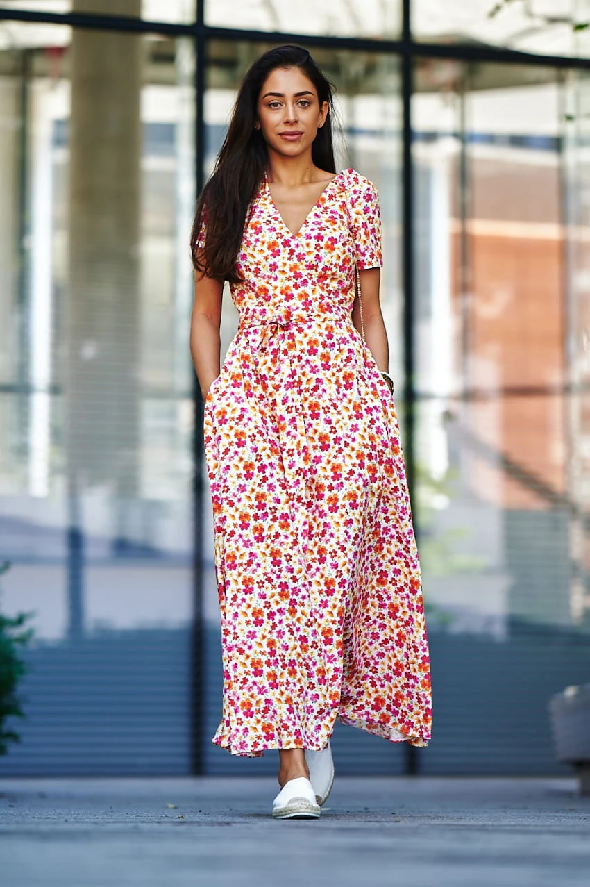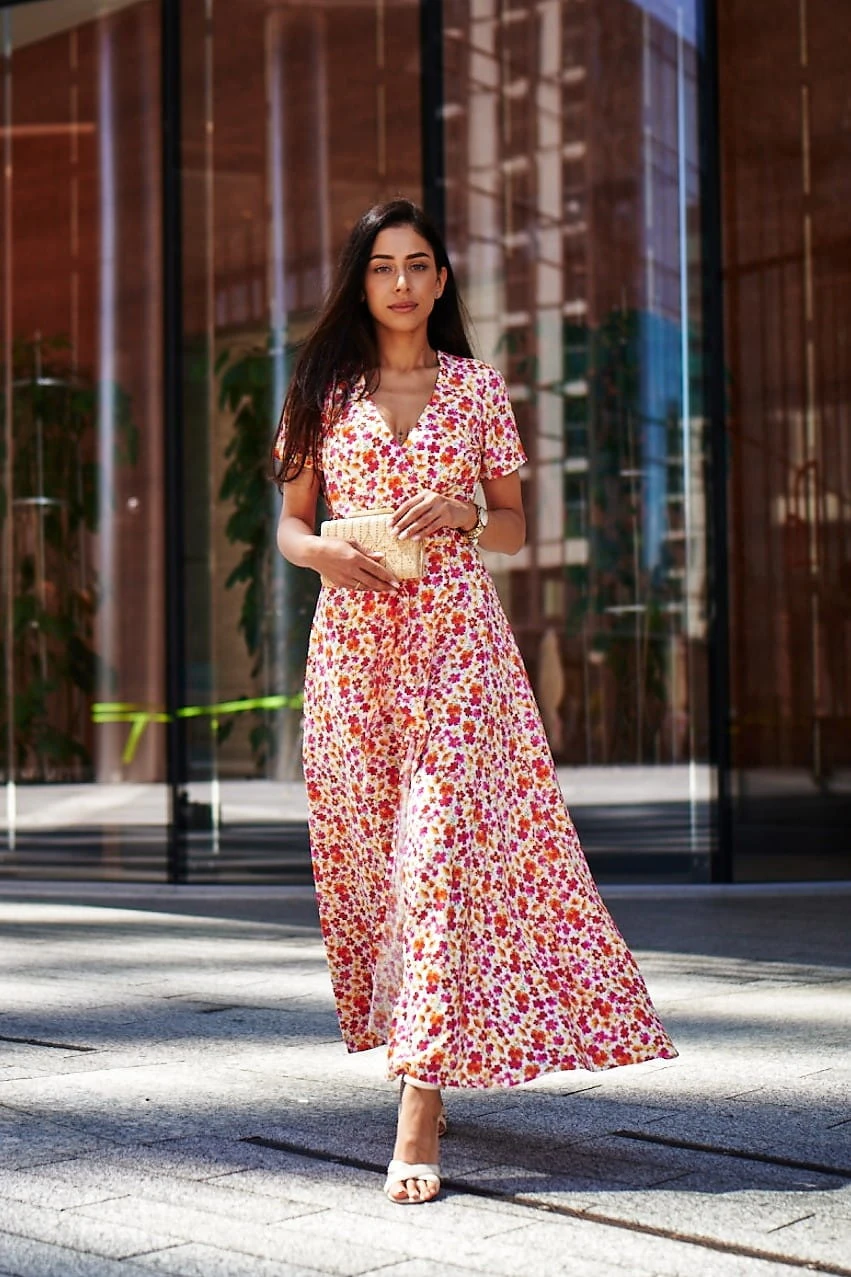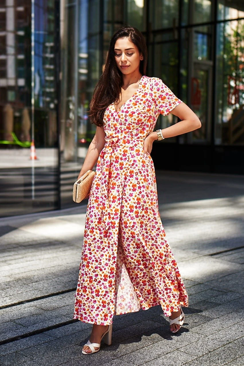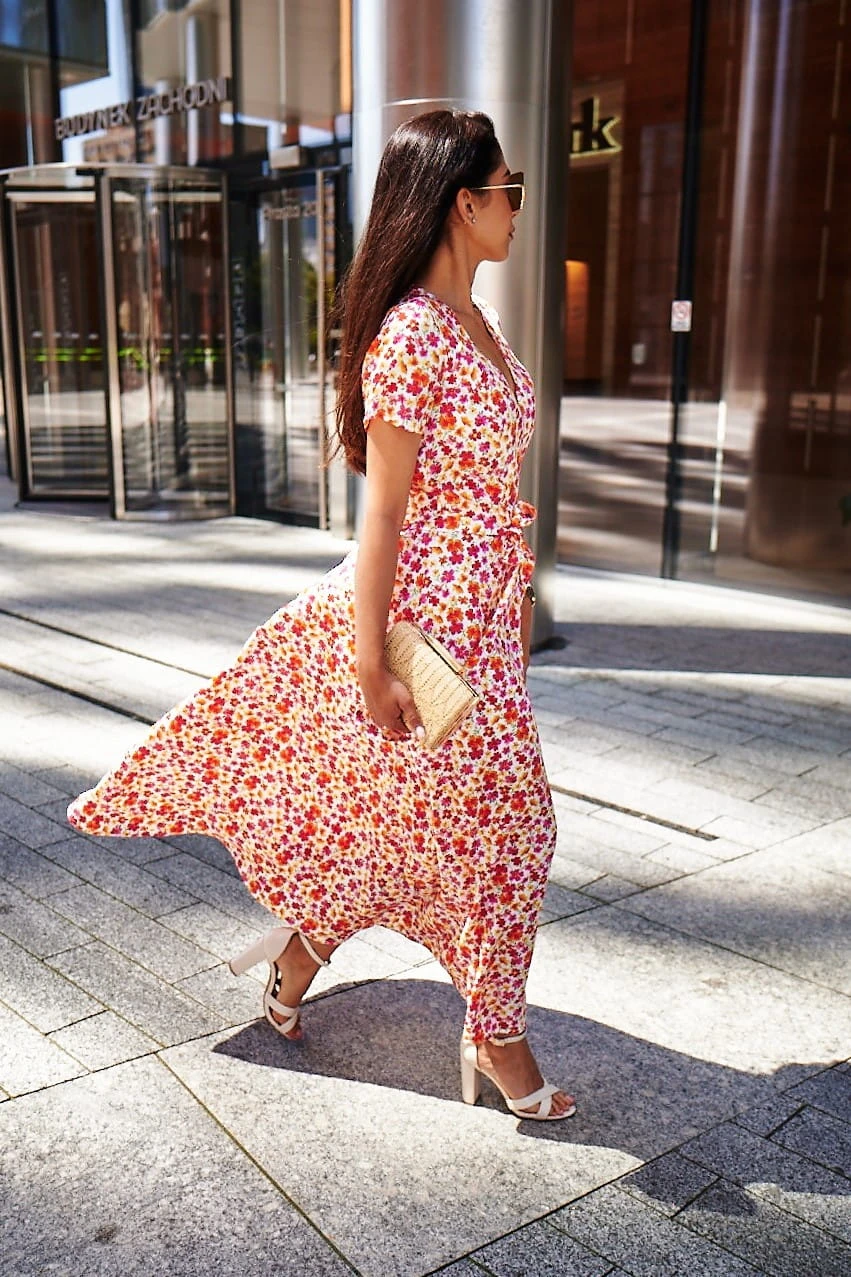 Sukienka Kopertowa Maxi to propozycja uszyta z delikatnej wiskozy o przepięknym kwiecistym princie w najmodniejszym połączeniu kolorystycznym w tym sezonie. Sukienka posiada kopertowy krój z szerokim i długim paskiem idealnie podkreślającym talie. Dekolt w serek efektownie eksponuje kobiece kształty i wydłuża sylwetkę. Rozporek na przedniej nodze ciekawie przełamują formę sukienki, nadając jej lekkości i powabności przy każdy kroku. Krótkie rękawki z marszczeniem na szczytach ramion dodają uroku. W szwach bocznych znajdziesz uwielbiane przez Ciebie kieszenie, możesz wrzucić do nich drobne, kluczyk od auta, albo po prostu schować ręce, by poczuć się na luzie ;)
