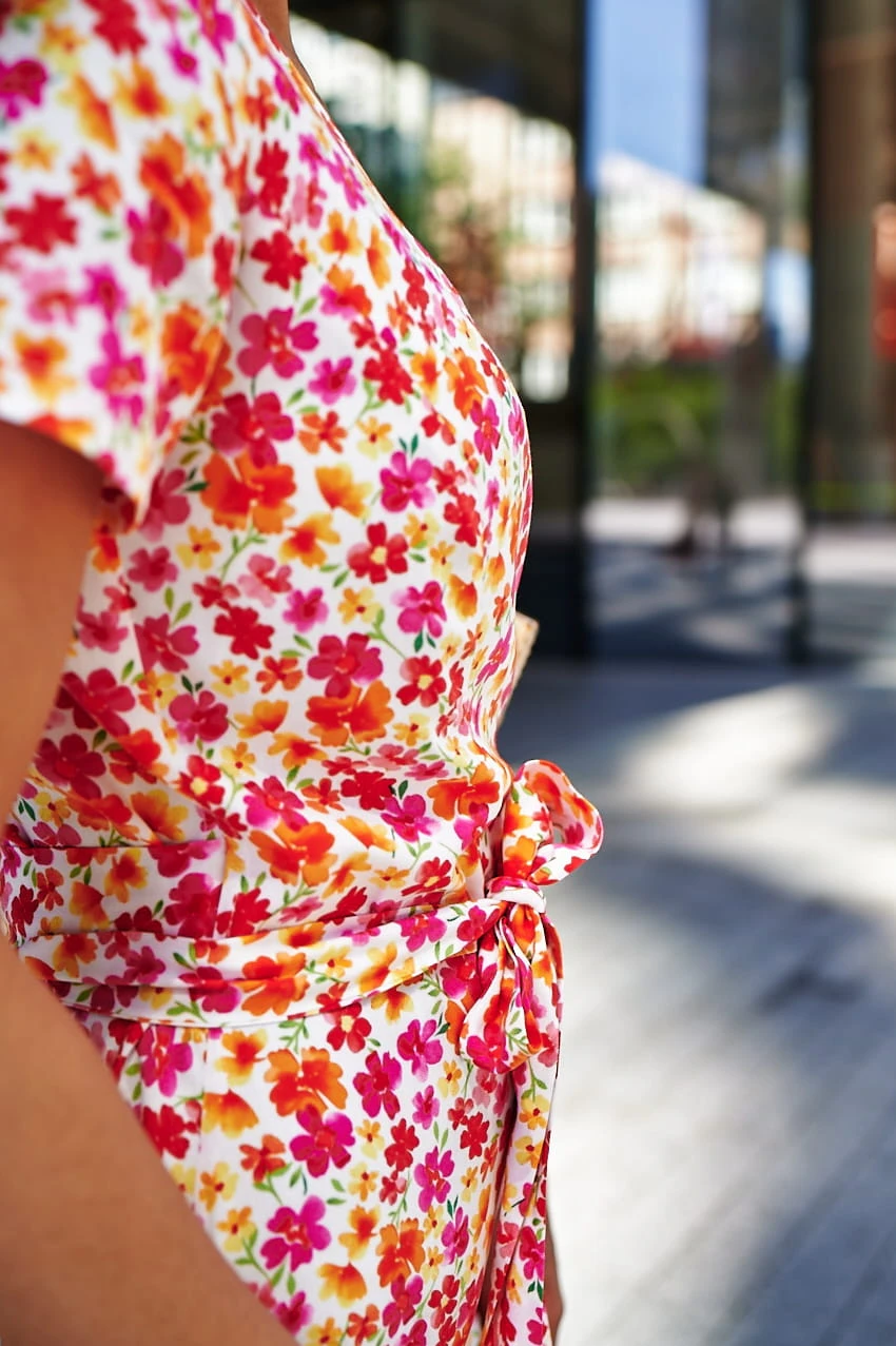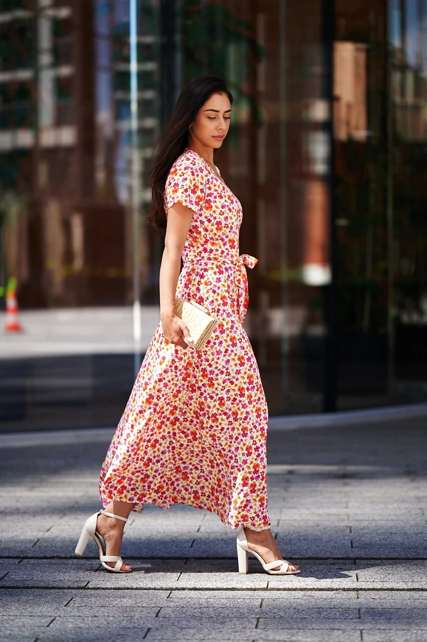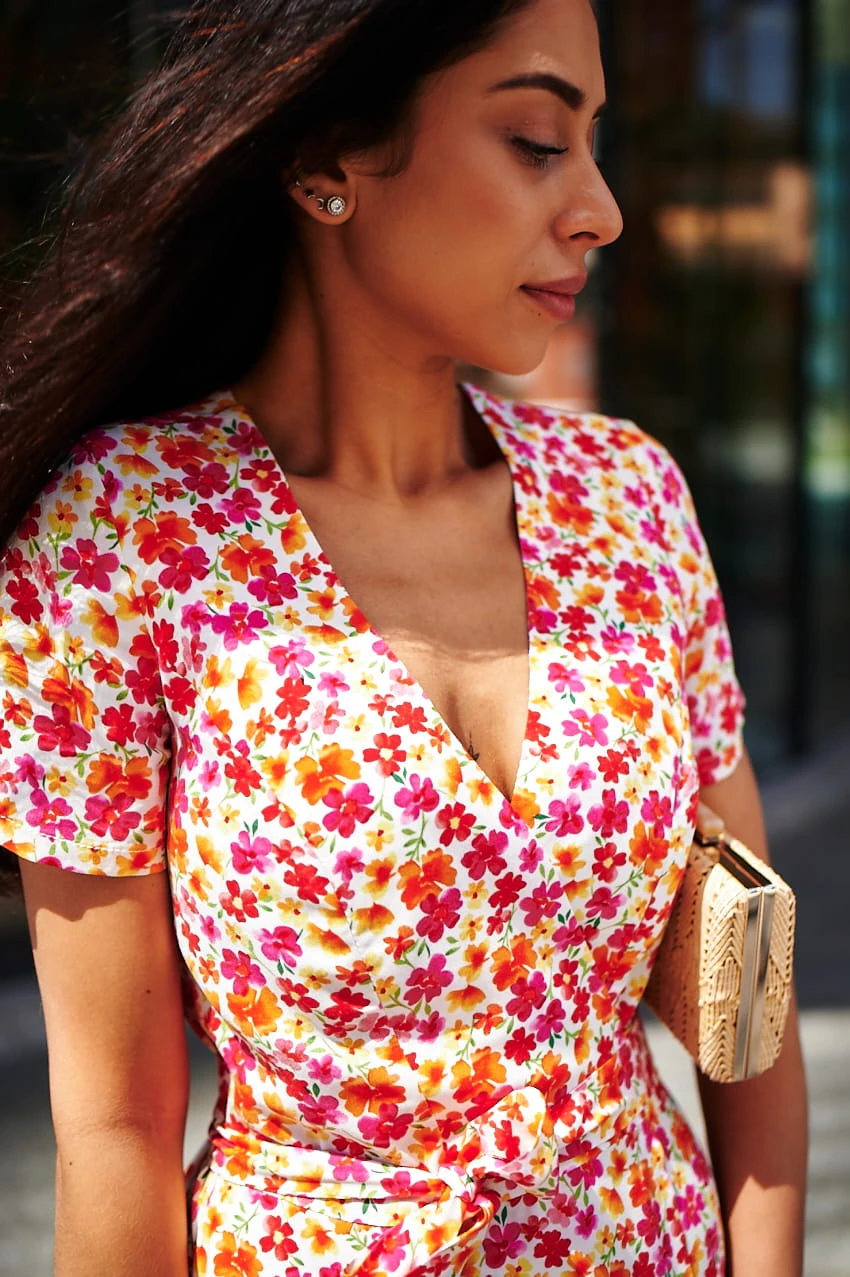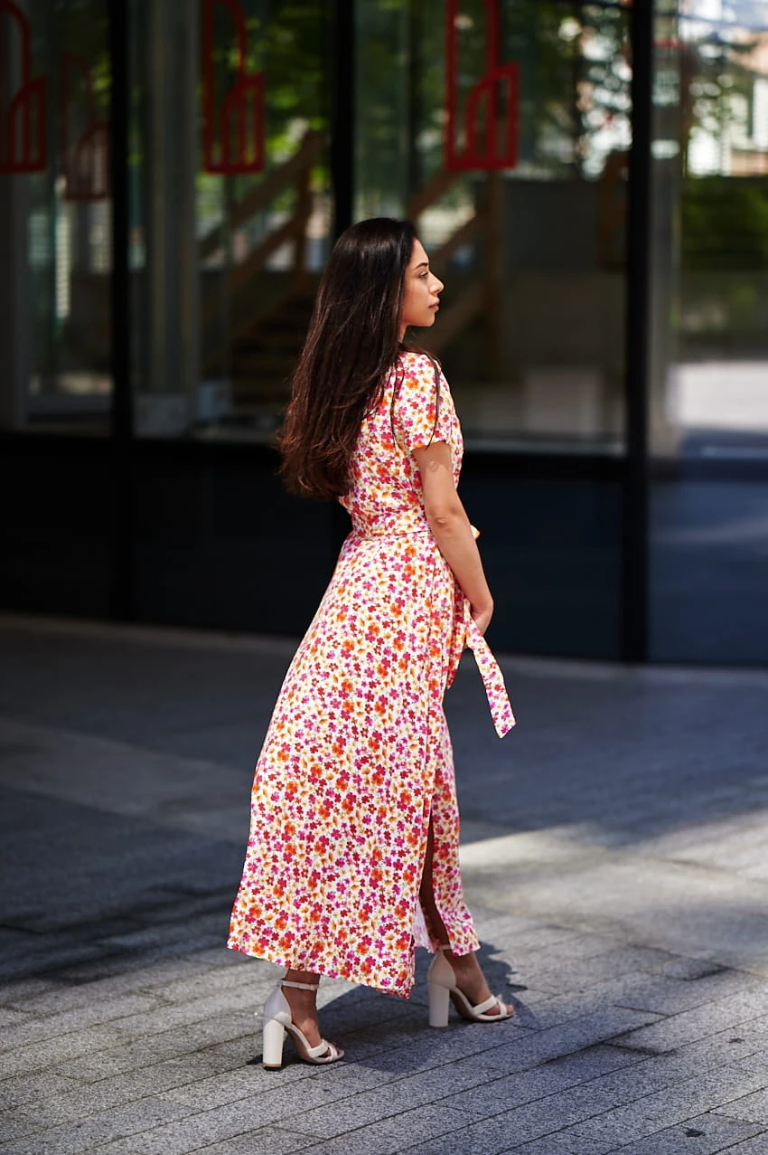Sukienka Kopertowa Maxi to propozycja uszyta z delikatnej wiskozy o przepięknym kwiecistym princie w najmodniejszym połączeniu kolorystycznym w tym sezonie. Sukienka posiada kopertowy krój z szerokim i długim paskiem idealnie podkreślającym talie. Dekolt w serek efektownie eksponuje kobiece kształty i wydłuża sylwetkę. Rozporek na przedniej nodze ciekawie przełamują formę sukienki, nadając jej lekkości i powabności przy każdy kroku. Krótkie rękawki z marszczeniem na szczytach ramion dodają uroku. W szwach bocznych znajdziesz uwielbiane przez Ciebie kieszenie, możesz wrzucić do nich drobne, kluczyk od auta, albo po prostu schować ręce, by poczuć się na luzie ;)