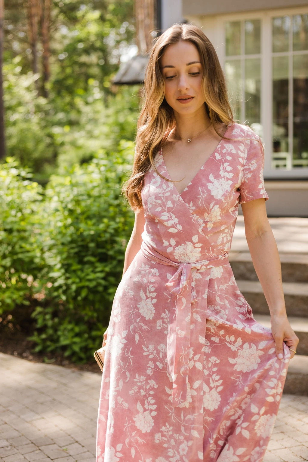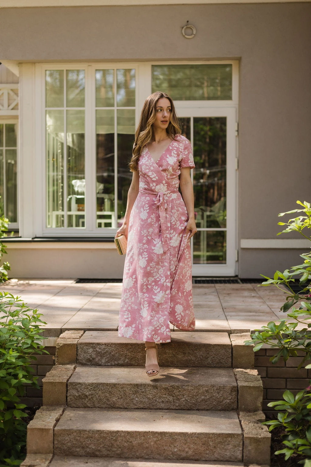 Sukienka Kopertowa Maxi to propozycja uszyta z delikatnej wiskozy o przepięknym kwiecistym princie. Sukienka posiada kopertowy krój z szerokim i długim paskiem idealnie podkreślającym talie. Dekolt w serek efektownie eksponuje kobiece kształty i wydłuża sylwetkę. Rozporek na przedniej nodze ciekawie przełamują formę sukienki, nadając jej lekkości i powabności przy każdy kroku. Krótkie rękawki z marszczeniem na szczytach ramion dodają uroku. W szwach bocznych znajdziesz uwielbiane przez Ciebie kieszenie, możesz wrzucić do nich drobne, kluczyk od auta, albo po prostu schować ręce, by poczuć się na luzie ;)