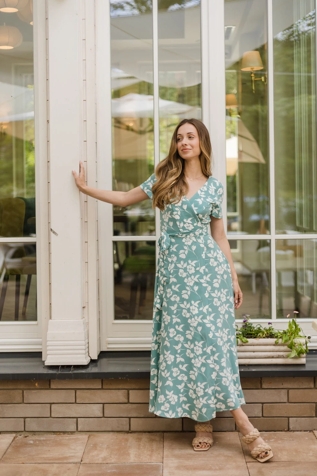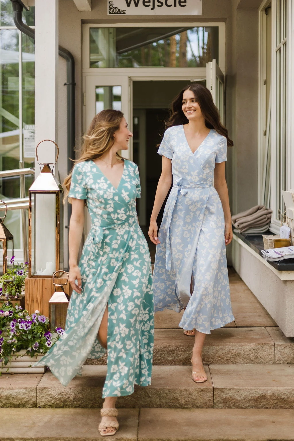 Sukienka Kopertowa Maxi to propozycja uszyta z delikatnej wiskozy o przepięknym kwiecistym princie. Sukienka posiada kopertowy krój z szerokim i długim paskiem idealnie podkreślającym talie. Dekolt w serek efektownie eksponuje kobiece kształty i wydłuża sylwetkę. Rozporek na przedniej nodze ciekawie przełamują formę sukienki, nadając jej lekkości i powabności przy każdy kroku. Krótkie rękawki z marszczeniem na szczytach ramion dodają uroku. W szwach bocznych znajdziesz uwielbiane przez Ciebie kieszenie, możesz wrzucić do nich drobne, kluczyk od auta, albo po prostu schować ręce, by poczuć się na luzie ;)