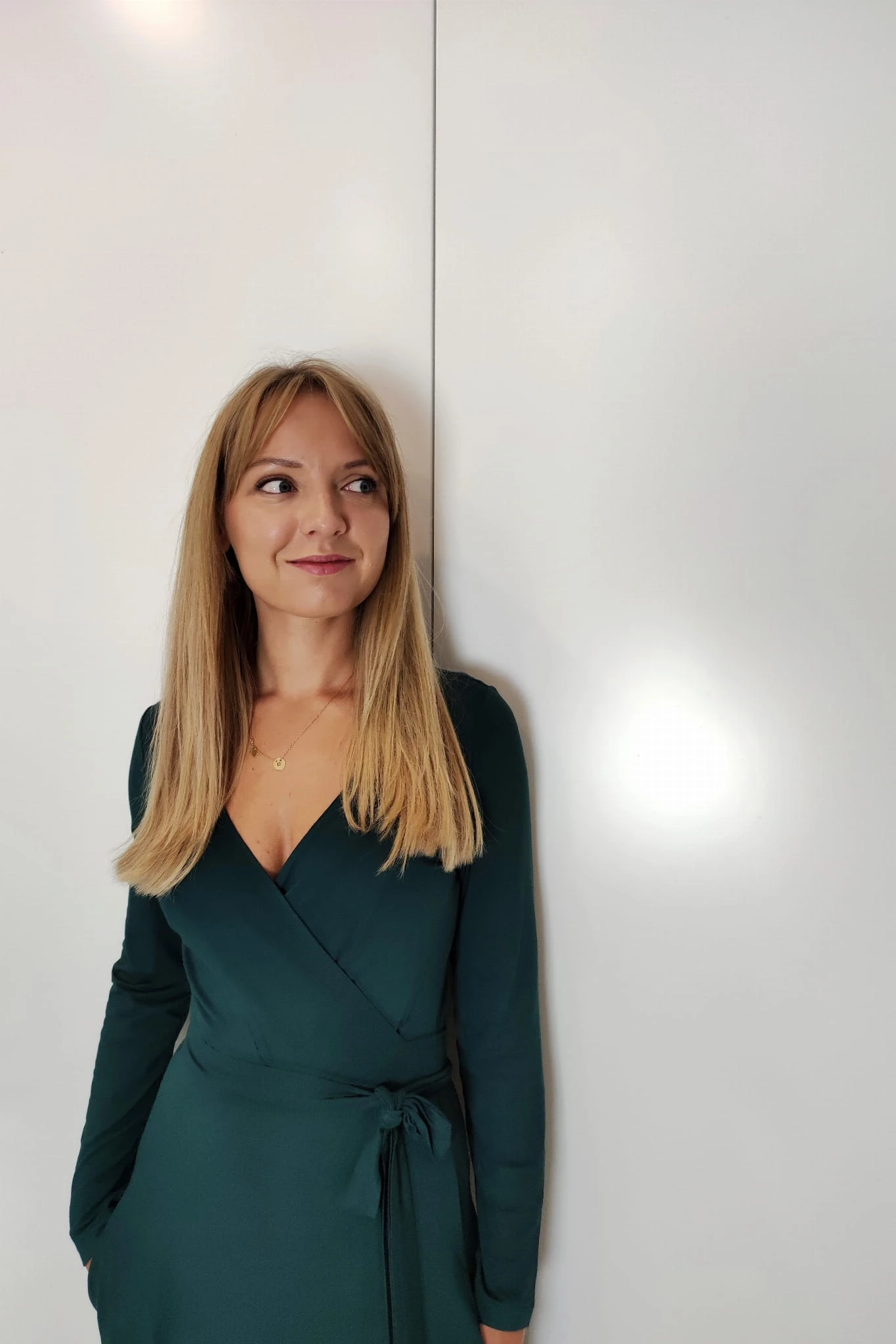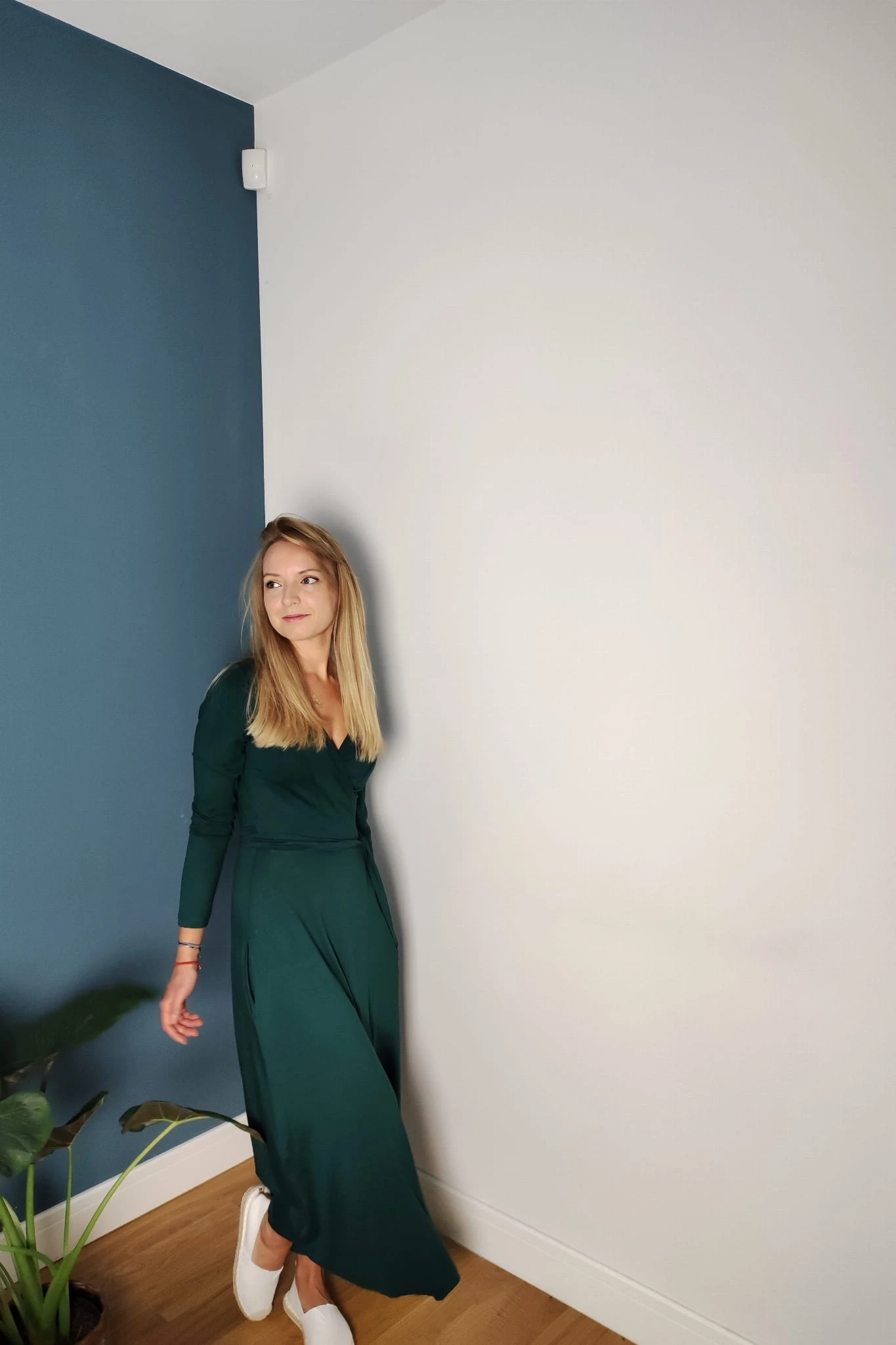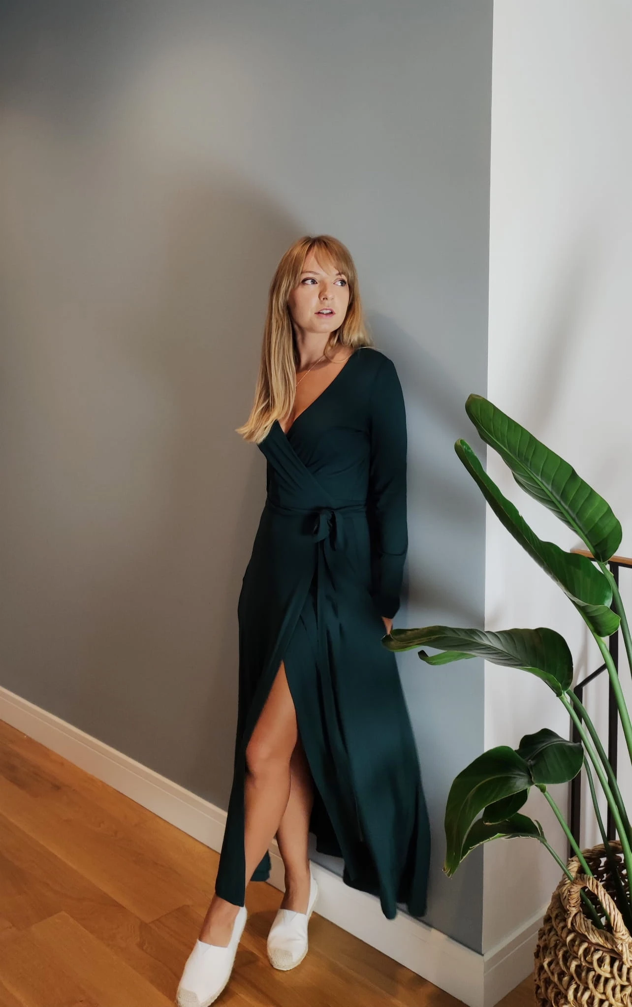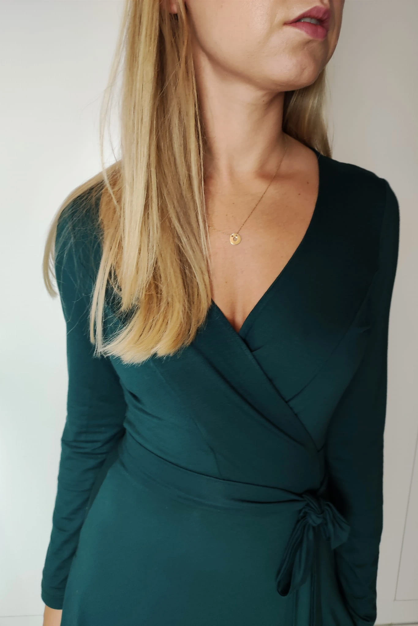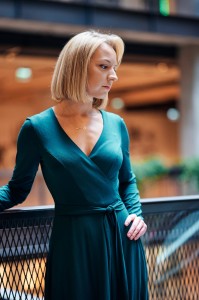Sukienka Kopertowa Maxi Szmaragdowa uszyta jest z niezwykle przyjemnej i lejącej dzianiny wiskozowej w kolorze głębokiego i zachwycającego szmaragdu.