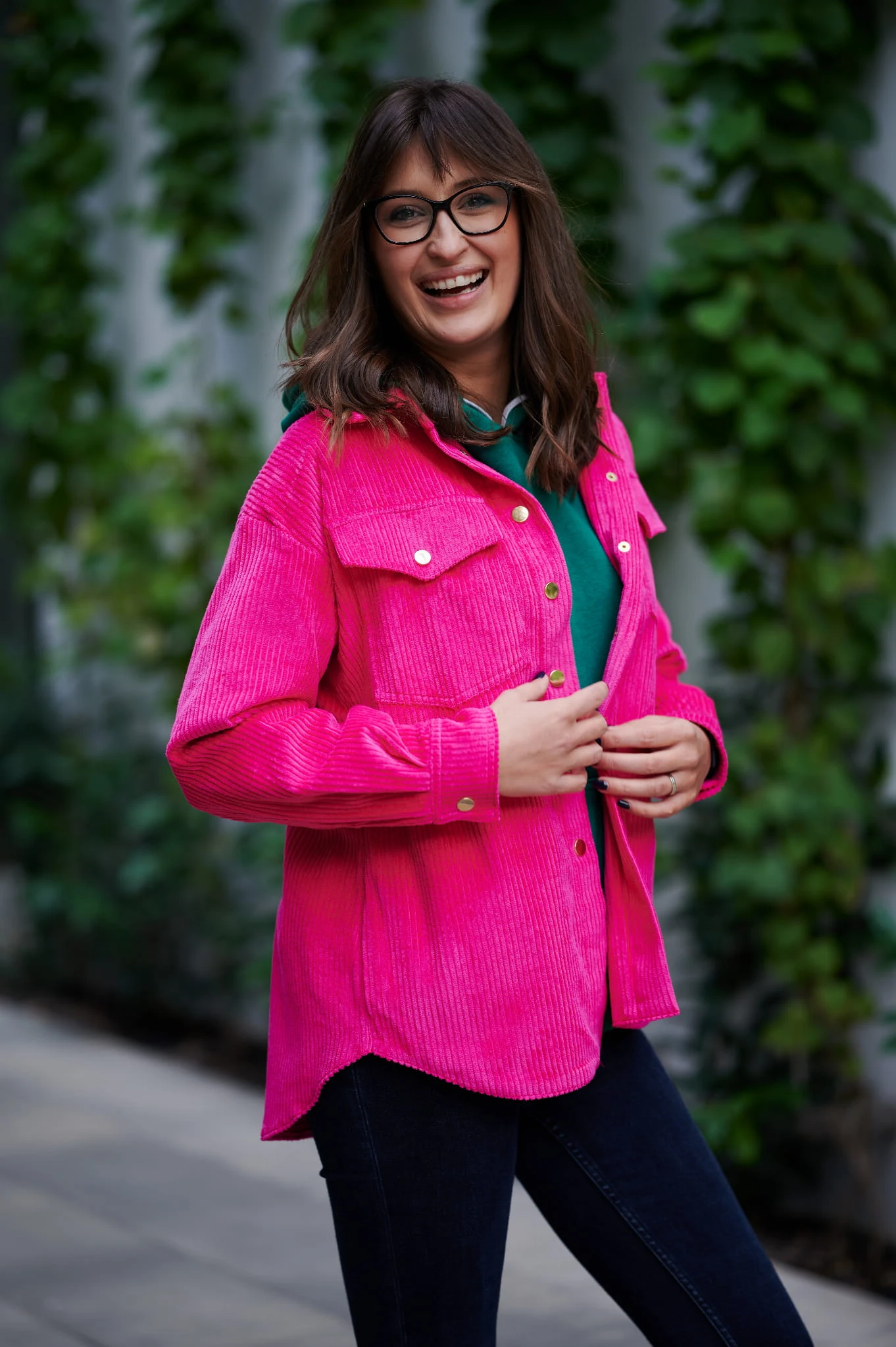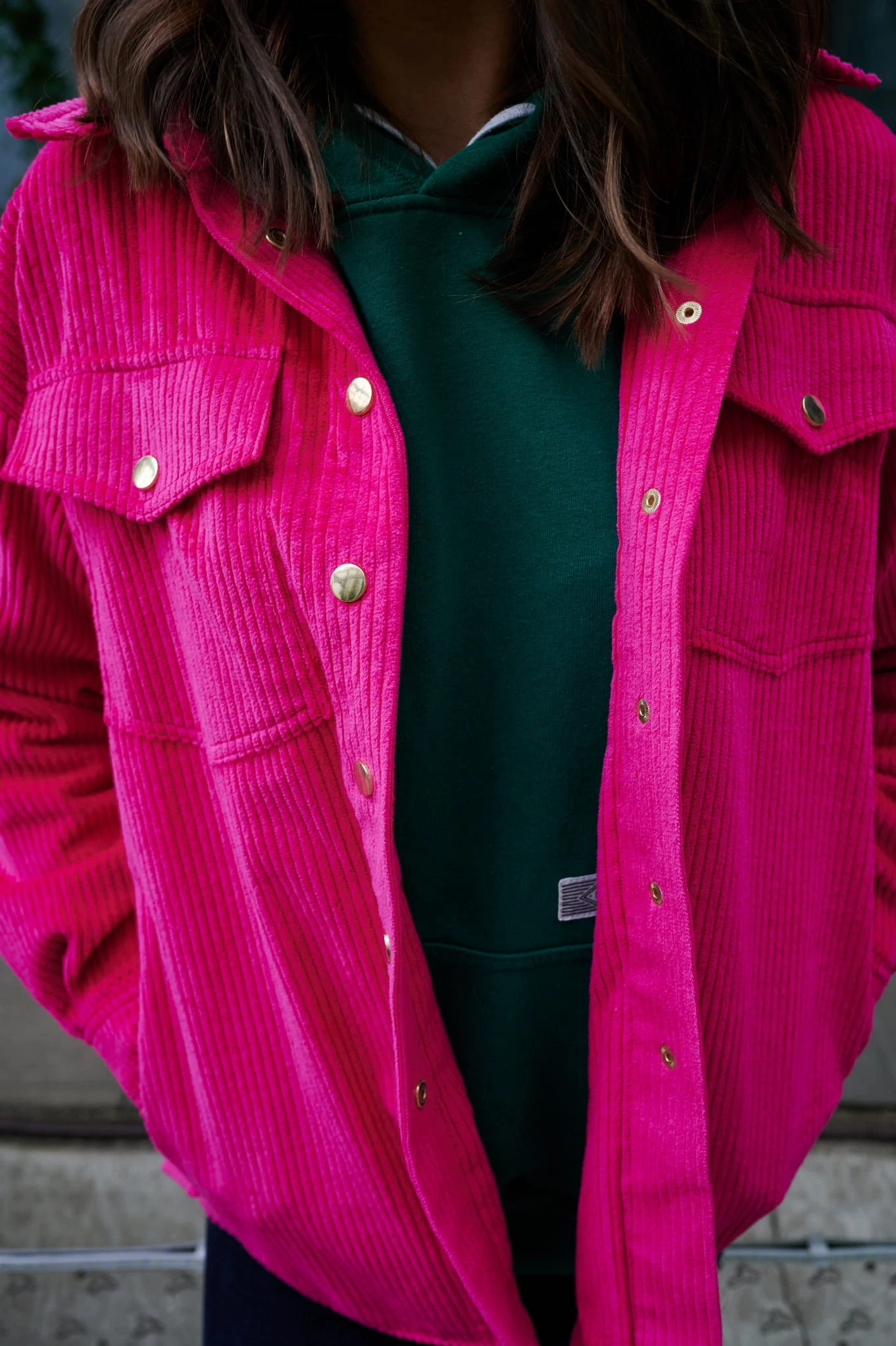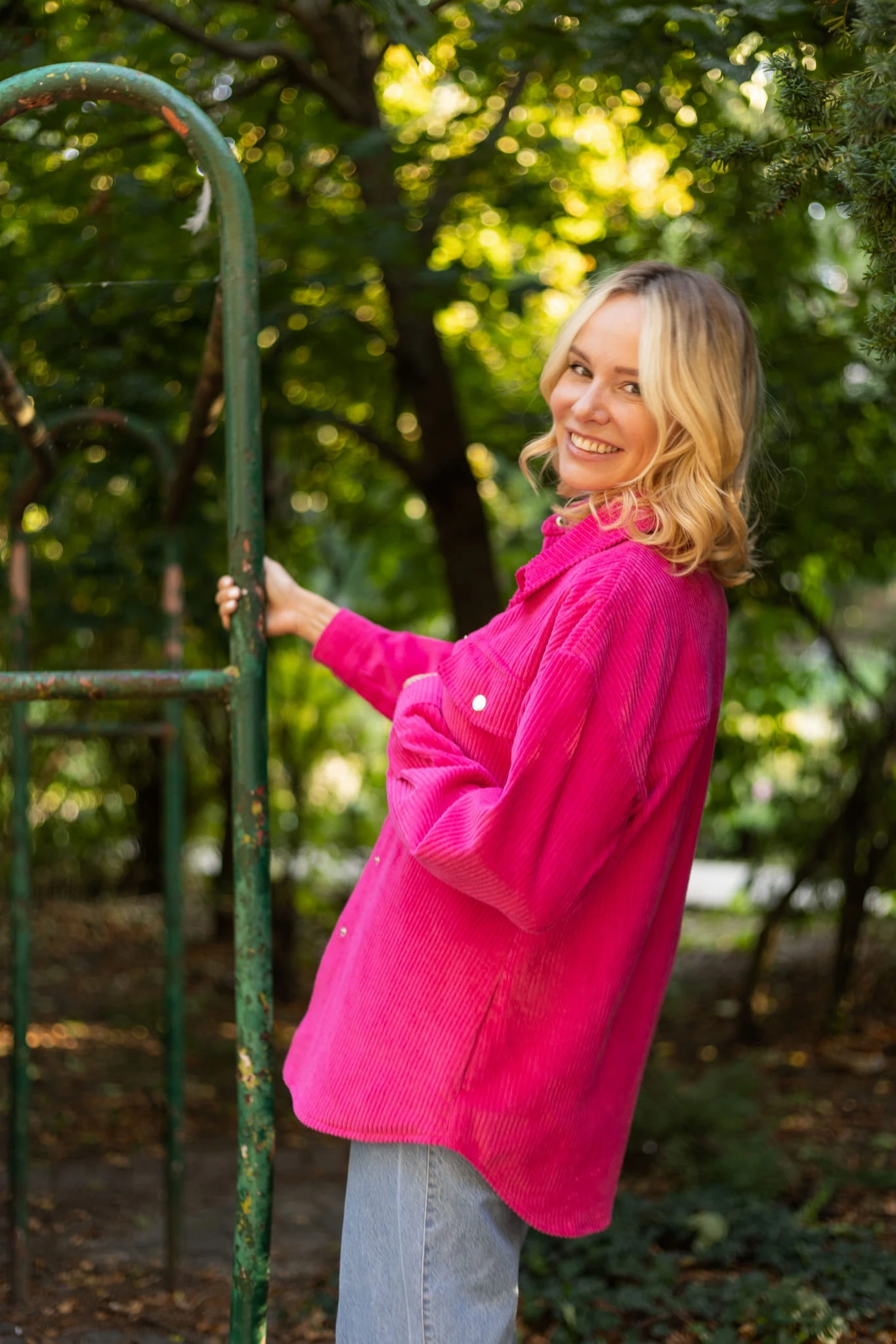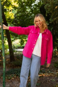 Kurtko- bluza uszyta została z mięsistego i aksamitnego sztruksu, który otuli Twoje ciało i sprawi, że będzie Ci w niej szalenie przyjemnie i wygodnie. Soczysta i i wyrazista fuksja to kolor, który doda energii Twojej stylizacji. Rewelacyjnie wygląda po prostu w basicowym zestawie, czyli dobrana do jeansów oraz jasnej koszulki, wiele przy niej nie trzeba.